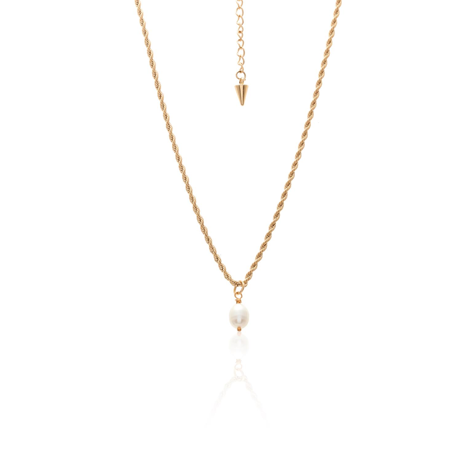 Tresor Necklace Pearl & Gold – Freshwater Pearl Peandant On Twisted rope Chain in 14k Gold plated stainless steel. Extension chain with spike and S Charm