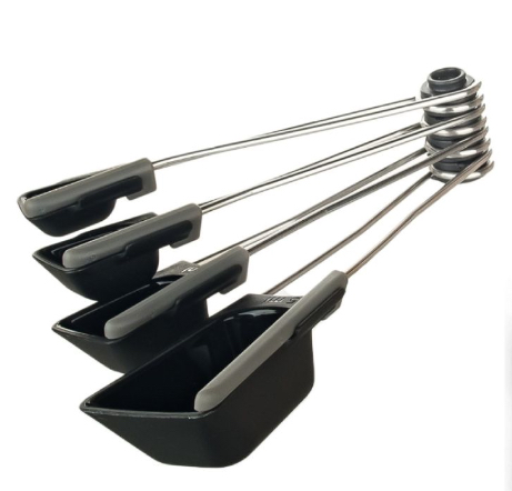 Levoons measuring spoons. They look like regular measuring spoons until you squeeze their handles to make a scraper swipe across and push off all the excess ingredients, giving you a perfectly level and accurate measurement. They are a set of 4 measuring spoons that snap together for storage, and can be easily snapped apart so you only have to wash the dirty ones.