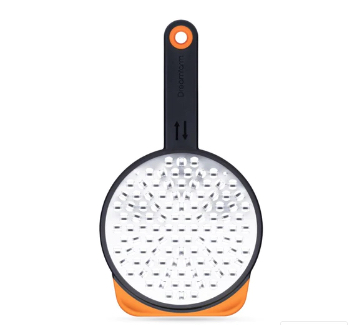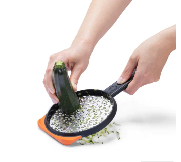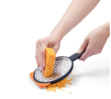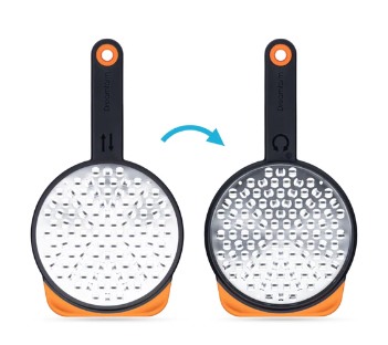 Ograte is a two-sided speed grater that continuously works in a circular motion on one side and an up and down motion on the other.